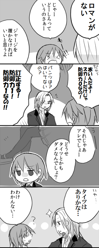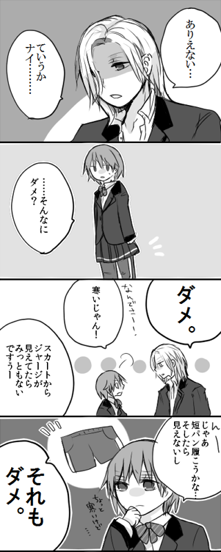 ※いろいろとごめんなさいなまんがスカートの下にジャージはいてる女の子が個人的にとても好きです。でもタイツもレギンスもいいと思います。好きです。生足ももちろん好きです。なに言ってんだろうねわたし。ていうかルカくんにこんなこと言わせてごめんなさい(先にそっちを謝れ
